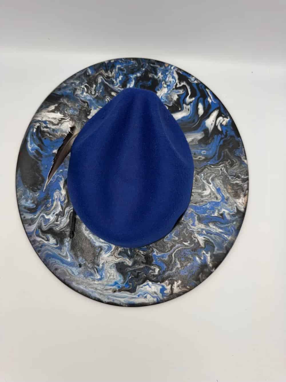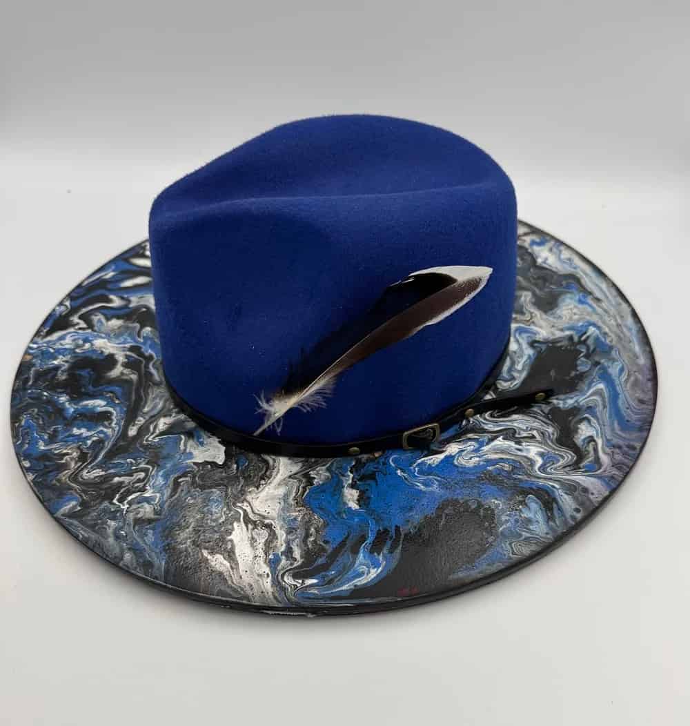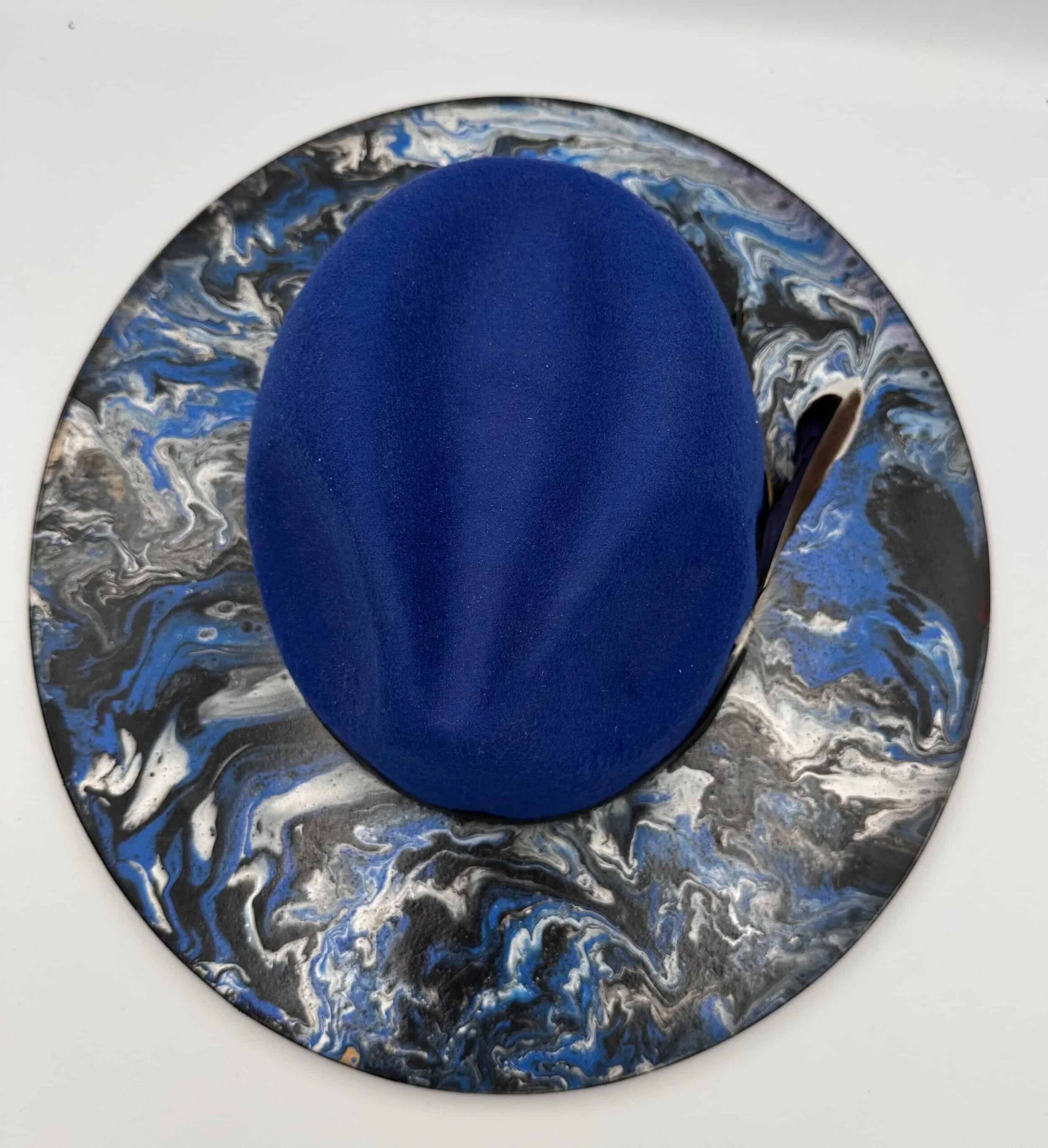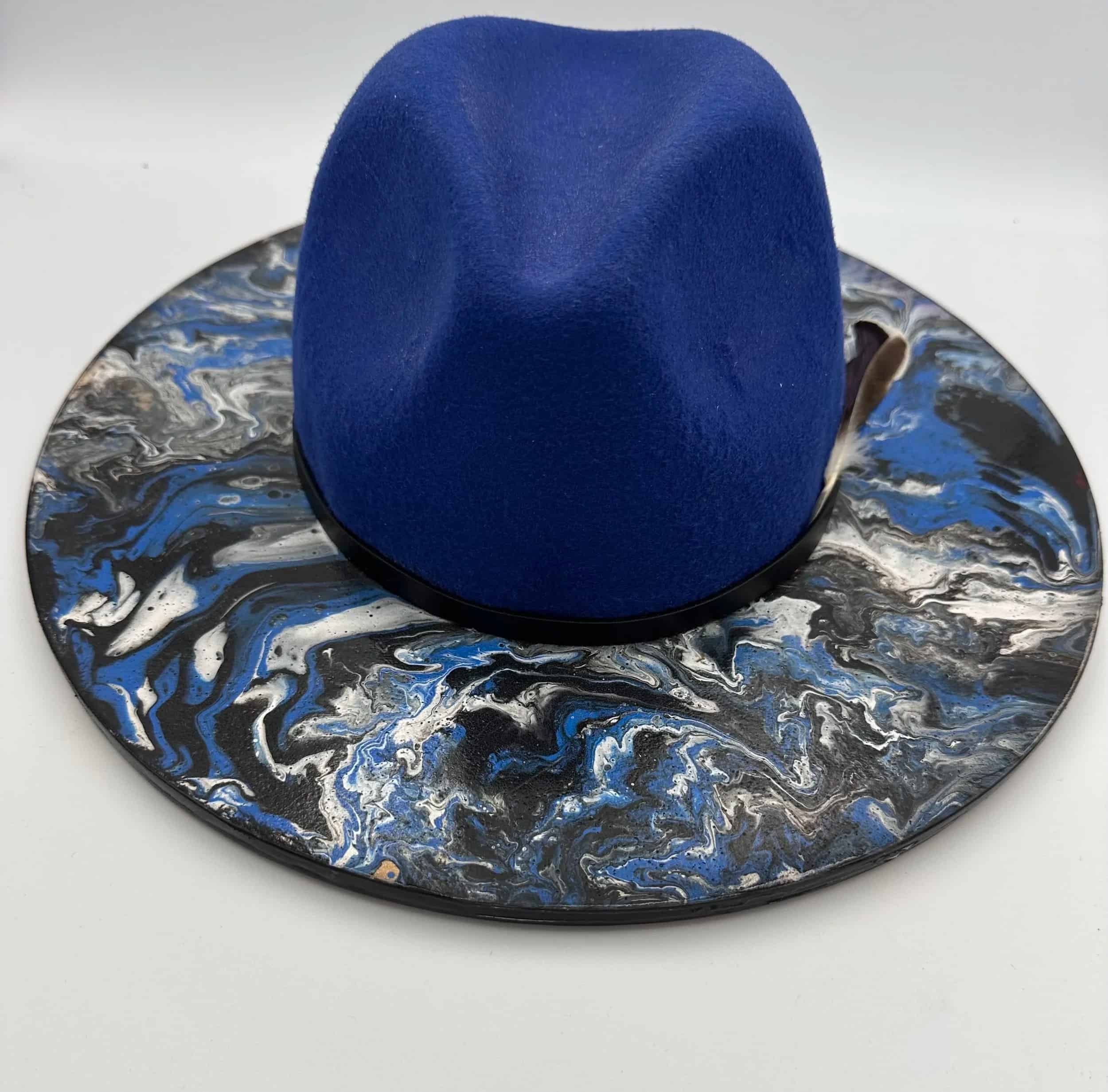 Make a bold impression with this handcrafted wooden brim hat, designed for those who appreciate artistry and individuality. The crown is made from premium wool felt, offering both structure and softness for a luxurious fit. Its standout feature—a striking acrylic pour brim in shades of black, blue, and white—creates a fluid, marbled effect that ensures no two hats are ever alike. Sized in large for a comfortable and confident fit, this piece is more than an accessory—it’s a wearable work of art.